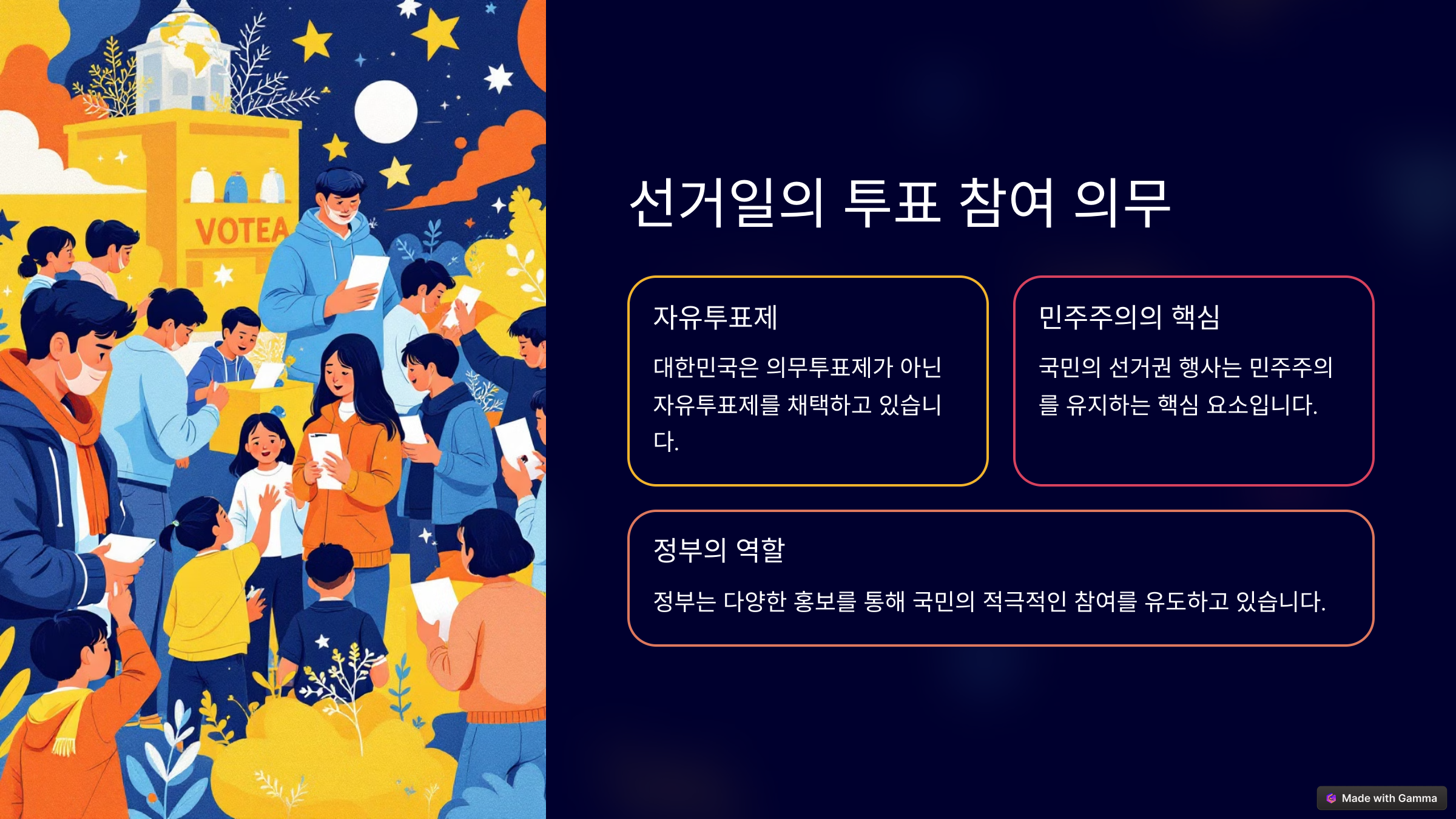 대한민국은 의무투표제가 아닌 자유투표제를 채택하고 있어, 국민이 반드시 투표해야 하는 것은 아닙니다. 하지만 국민의 선거권(투표권) 행사는 민주주의를 유지하는 핵심 요소이므로, 정부는 다양한 홍보를 통해 국민의 적극적인 참여를 유도하고 있습니다.