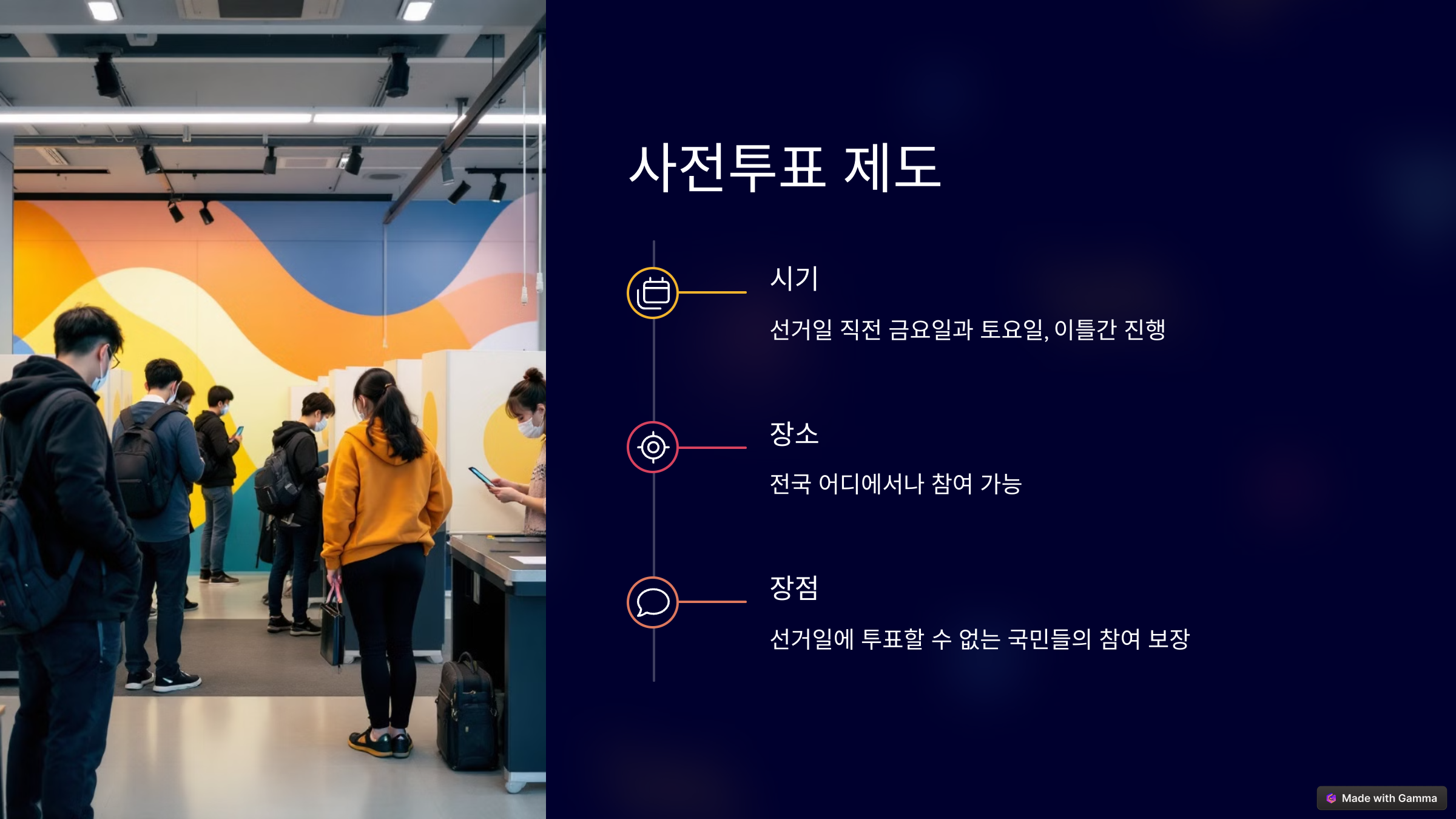 - 사전투표 제도가 도입되어 선거일 전에 투표할 수 있음.
