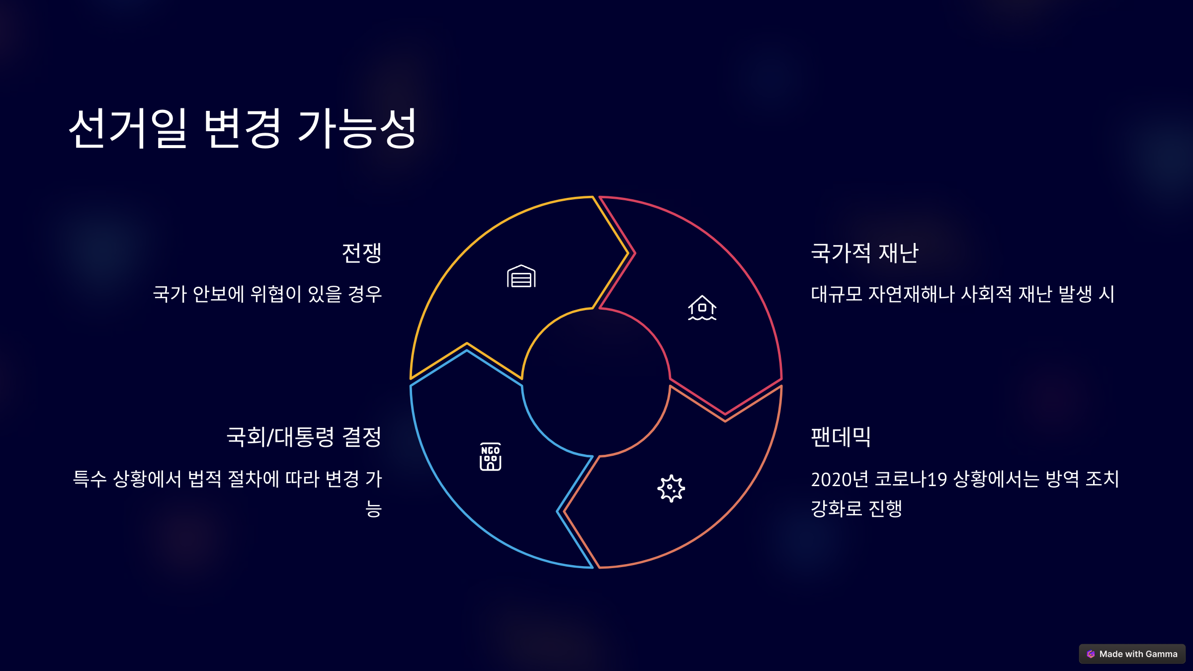 특정 상황(전쟁, 국가적 재난 등)에서는 국회나 대통령의 결정에 따라 선거일이 변경될 수도 있습니다. 예를 들어, 2020년 코로나19 팬데믹 상황에서도 선거가 예정대로 진행되었지만, 방역 조치를 강화하여 안전한 투표 환경을 조성한 바 있습니다.