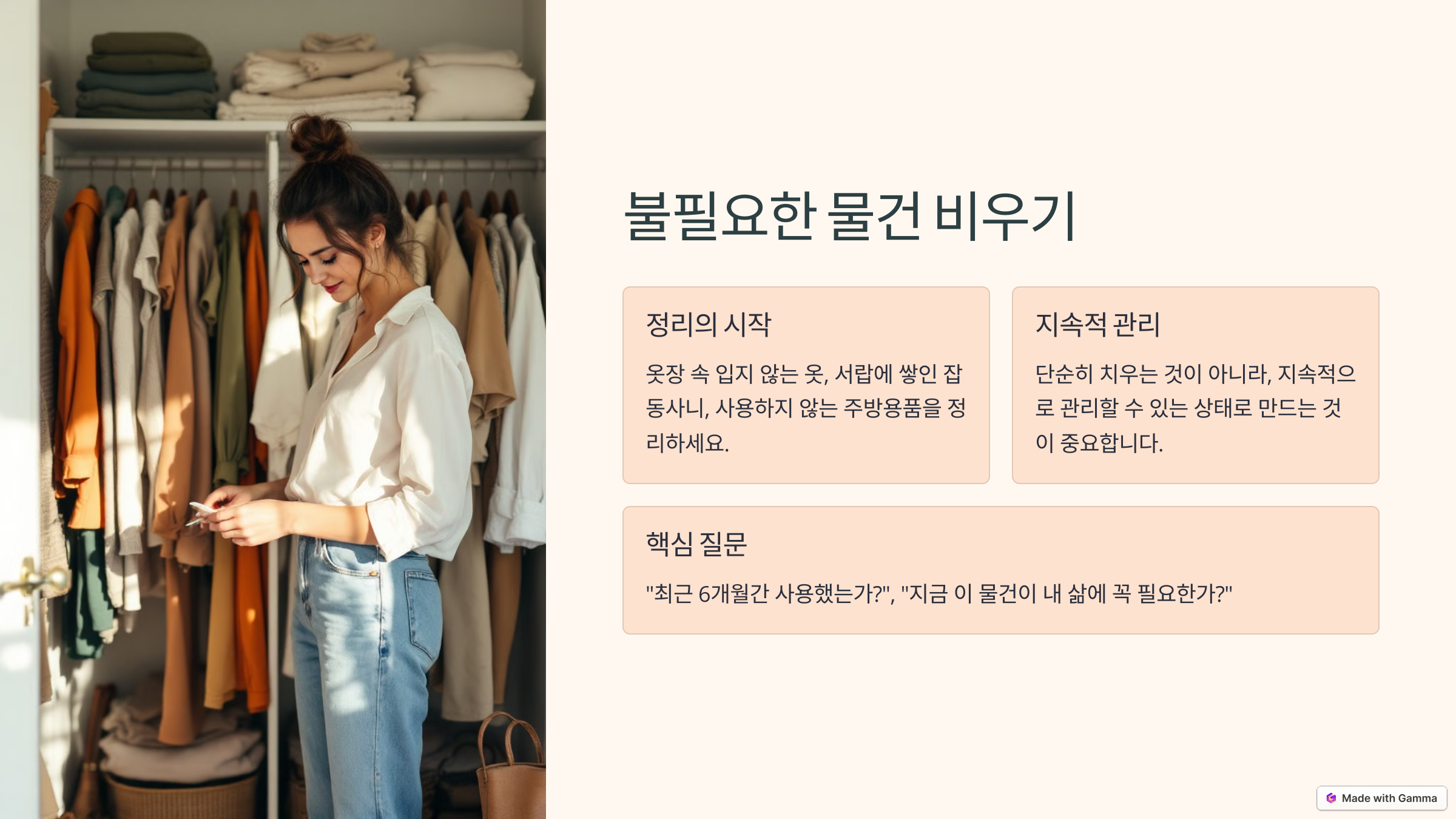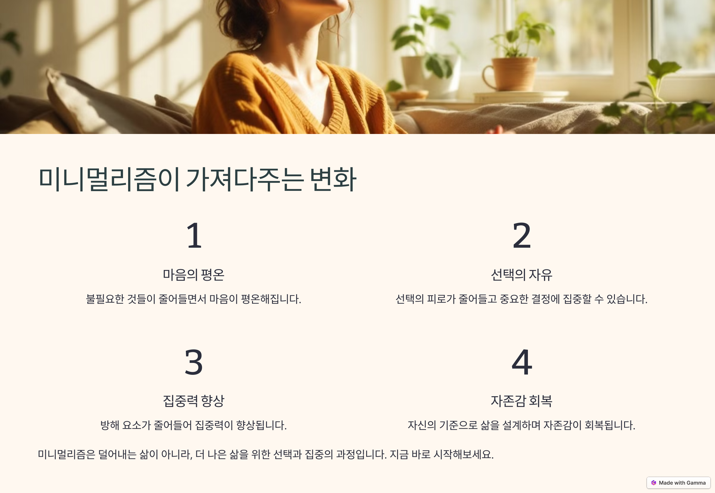 ‘더 적게 소유하면서 더 많이 누리는 삶’, 바로 이것이 미니멀리즘이 가져다주는 궁극적인 변화입니다. 물건을 줄이는 것에서 시작해, 삶의 우선순위를 재정비하고, 나에게 진짜 중요한 것이 무엇인지 깨닫는 과정은 우리가 더 나은 방향으로 성장할 수 있게 합니다.