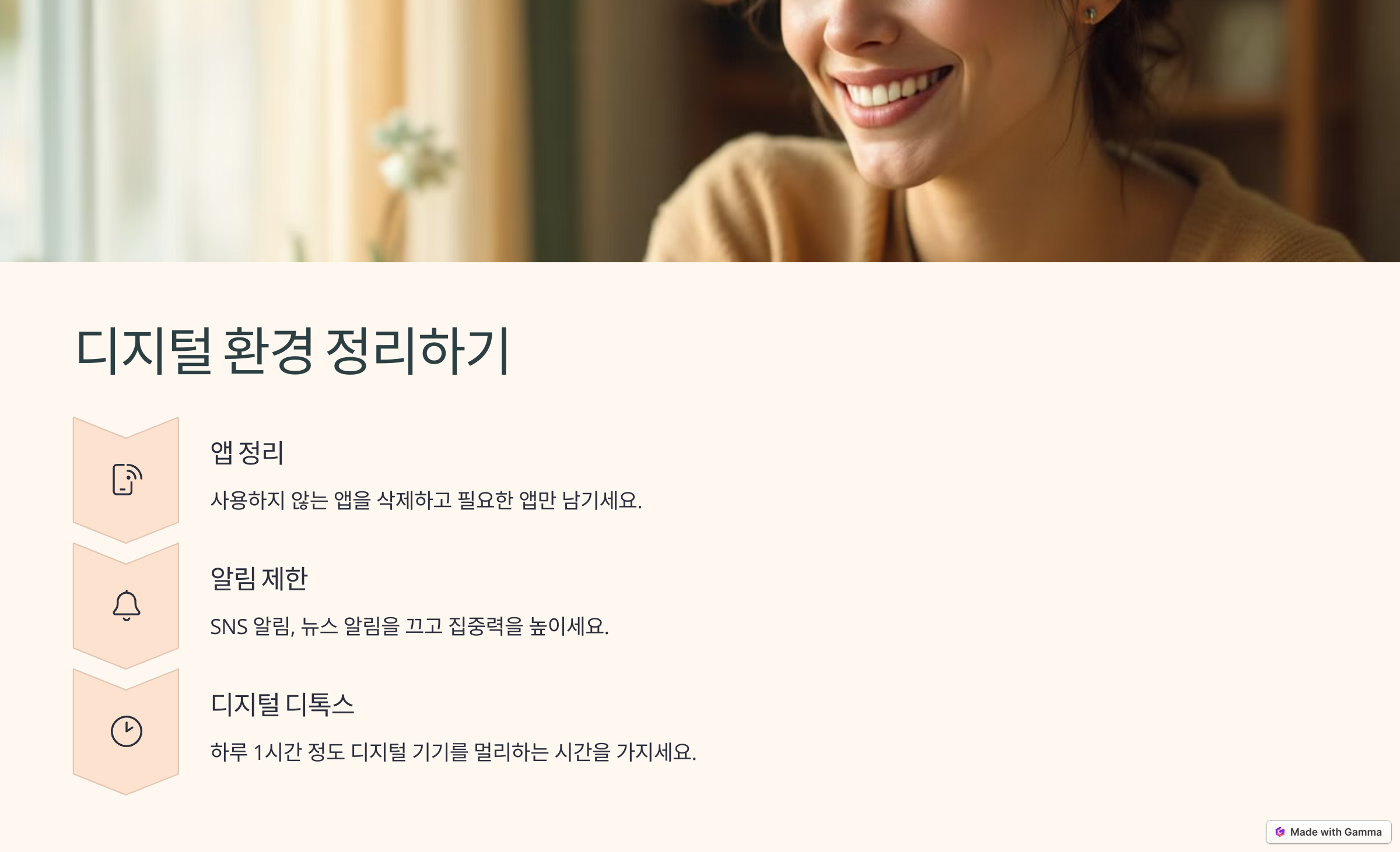 우리는 하루의 상당 시간을 디지털 기기와 함께 보냅니다. 그러나 그 안에도 과도한 정보, 불필요한 알림, 사용하지 않는 앱들이 끊임없이 집중을 방해합니다. 디지털 미니멀리즘은 정보 소비를 의식적으로 통제하는 방식입니다. SNS 사용 시간 제한, 앱 정리, 뉴스 알림 끄기 등을 통해 정보 과부하를 줄이고, 뇌에 여유 공간을 만들어 주세요. 하루 1시간 정도 ‘디지털 디톡스’ 시간을 갖는 것도 효과적입니다.