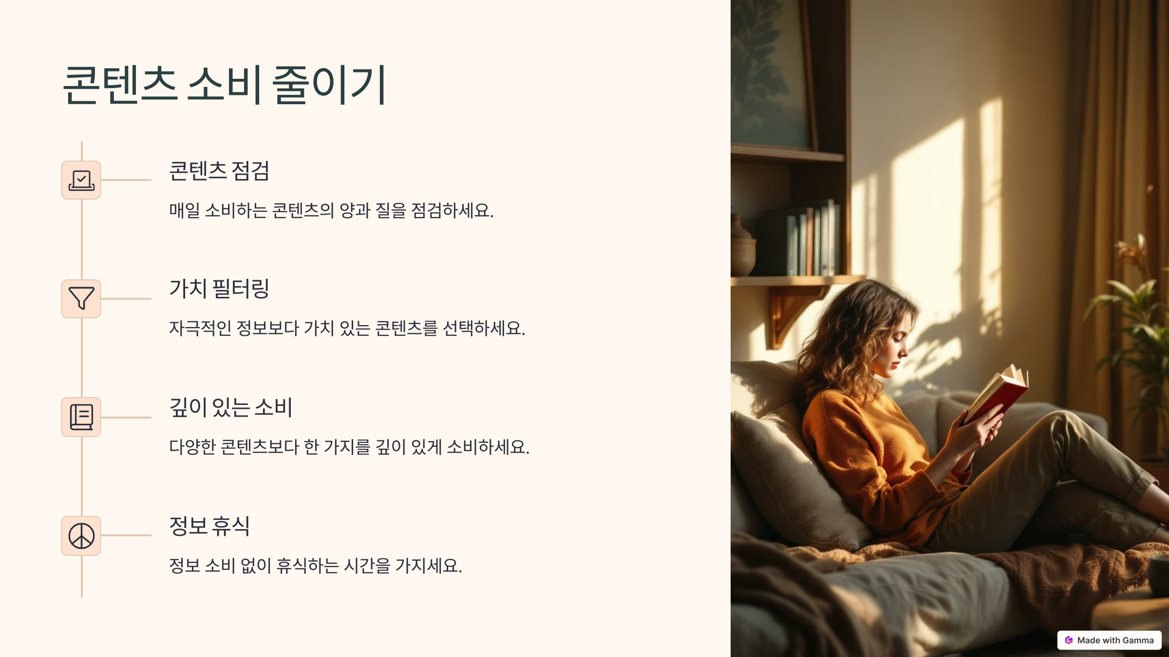 책, 영상, SNS, 뉴스 등 우리는 하루에도 수많은 콘텐츠를 소비합니다. 그러나 정보의 양이 많다고 해서 삶이 더 나아지는 것은 아닙니다. 오히려 불안감, 비교 심리, 집중력 저하로 이어지기도 합니다. 매일 소비하는 콘텐츠의 양과 질을 점검하고, 자극적인 정보보다 가치 있는 콘텐츠에 시간을 투자해보세요.