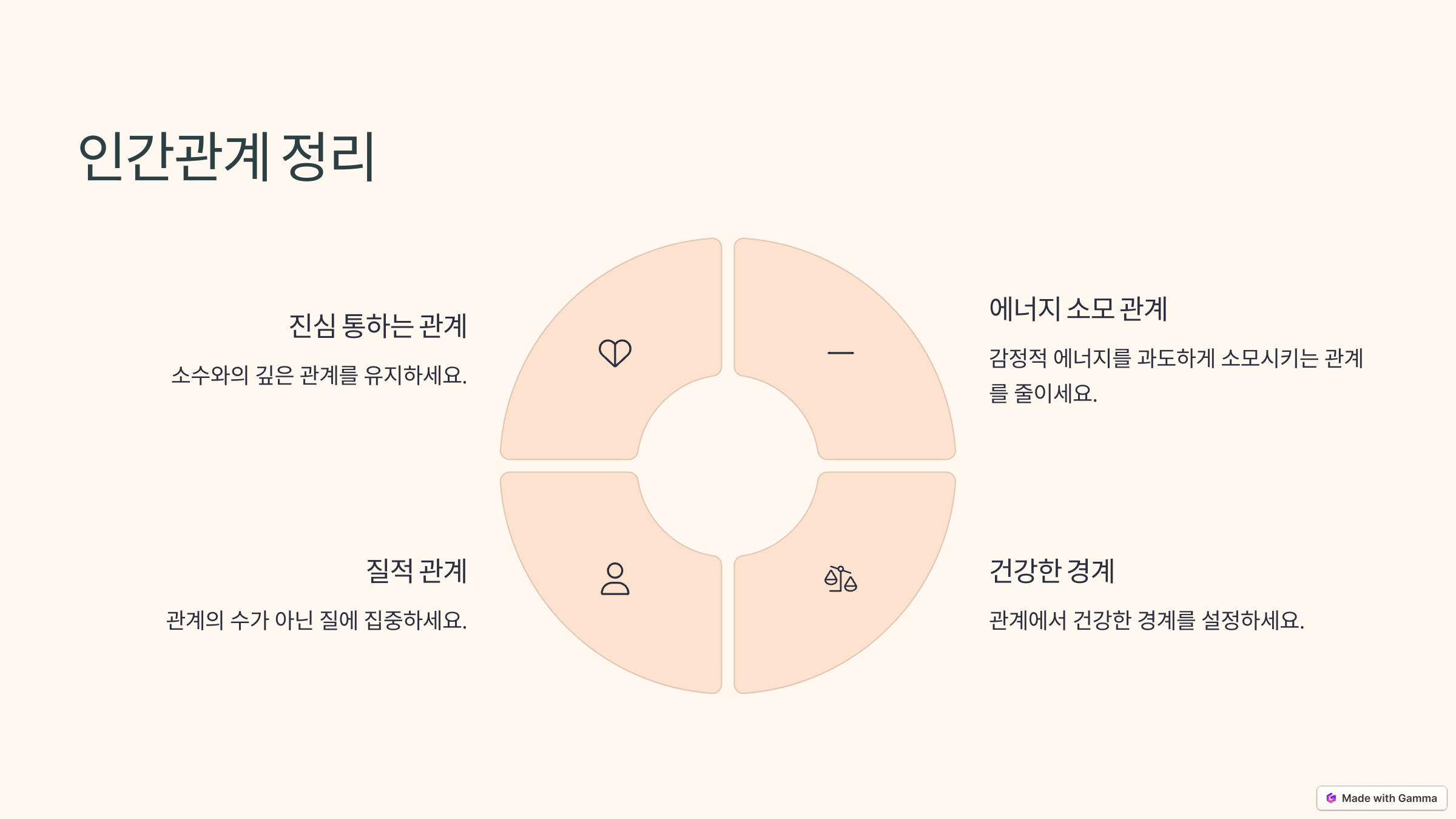 미니멀리즘은 인간관계에서도 적용할 수 있습니다. 억지로 유지하거나 피로감을 주는 관계는 삶의 질을 떨어뜨릴 수 있습니다. 무조건 사람 수를 줄이자는 것이 아니라, 감정적 에너지를 과도하게 소모시키는 관계를 줄이자는 것입니다. 진심이 통하는 소수와 깊은 관계를 유지하는 것이 장기적으로 더 건강한 인간관계입니다.