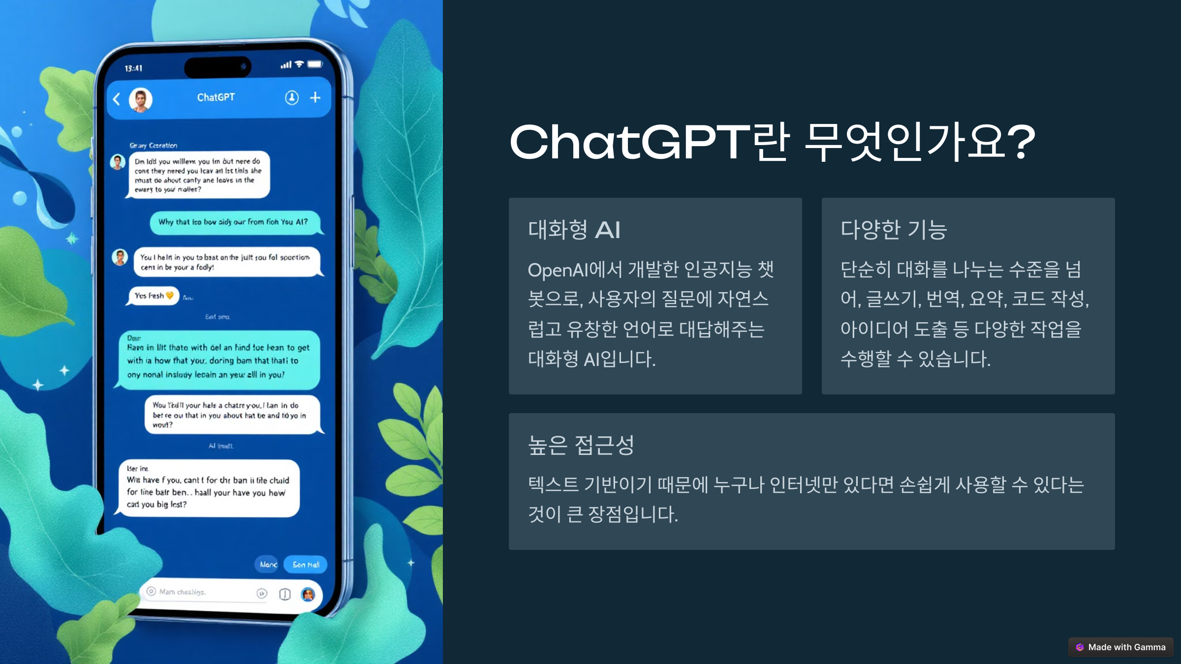 ChatGPT는 OpenAI에서 개발한 인공지능 챗봇으로, 사용자의 질문에 자연스럽고 유창한 언어로 대답해주는 대화형 AI입니다. 단순히 대화를 나누는 수준을 넘어, 글쓰기, 번역, 요약, 코드 작성, 아이디어 도출 등 다양한 작업을 수행할 수 있습니다. 무엇보다도 텍스트 기반이기 때문에 누구나 인터넷만 있다면 손쉽게 사용할 수 있다는 것이 큰 장점입니다.