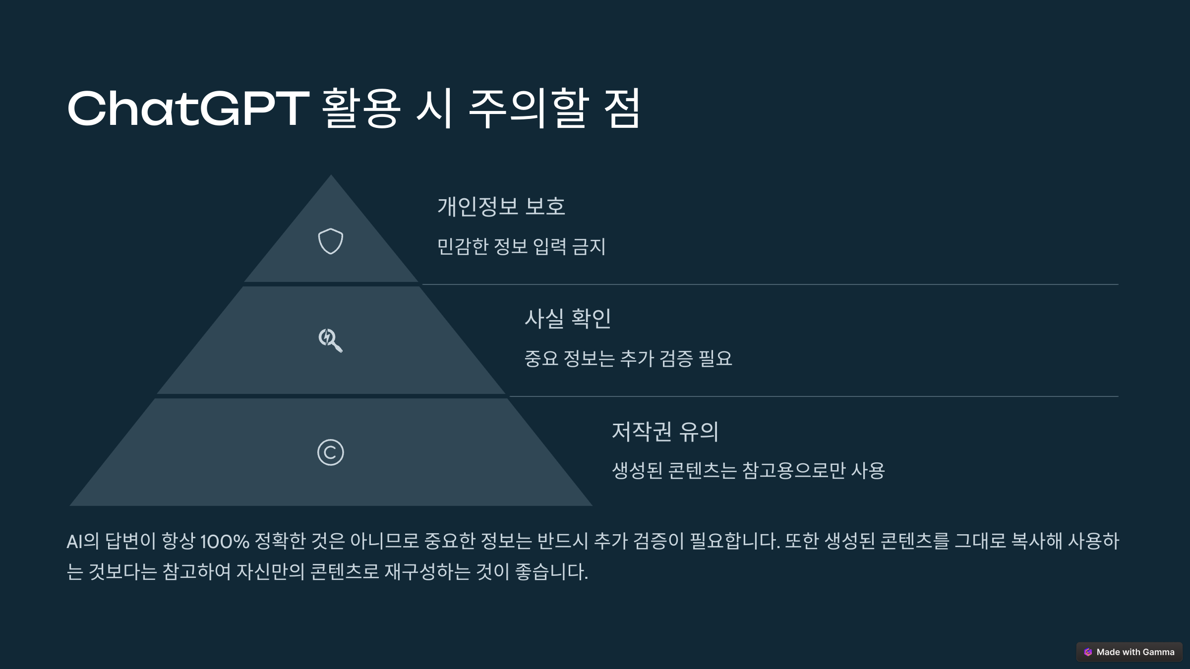 - 사실 확인 필요: AI의 답변이 항상 100% 정확한 것은 아니므로 중요한 정보는 추가 검증이 필요합니다.