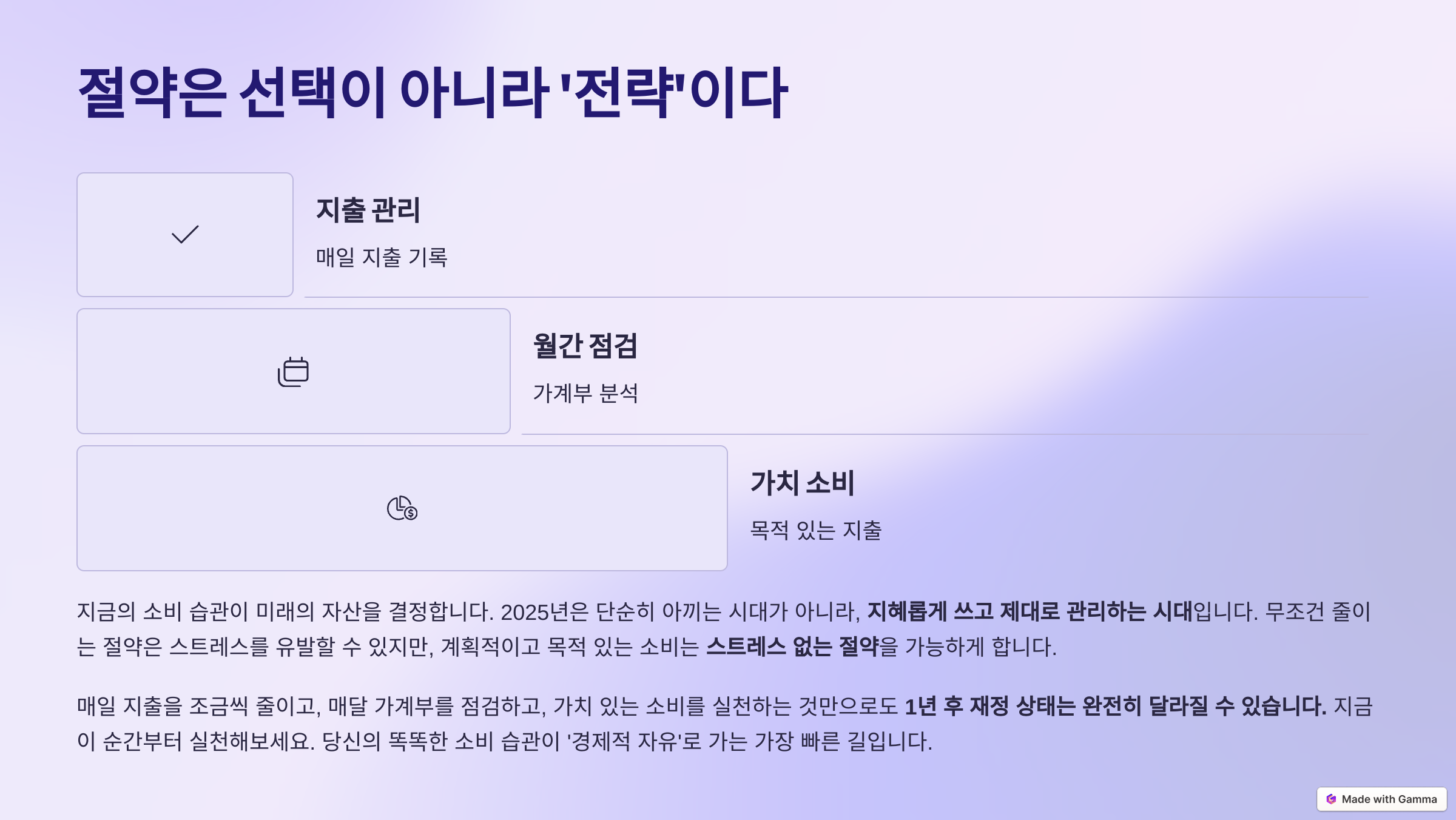 2025년은 단순히 아끼는 시대가 아니라, 지혜롭게 쓰고 제대로 관리하는 시대입니다.